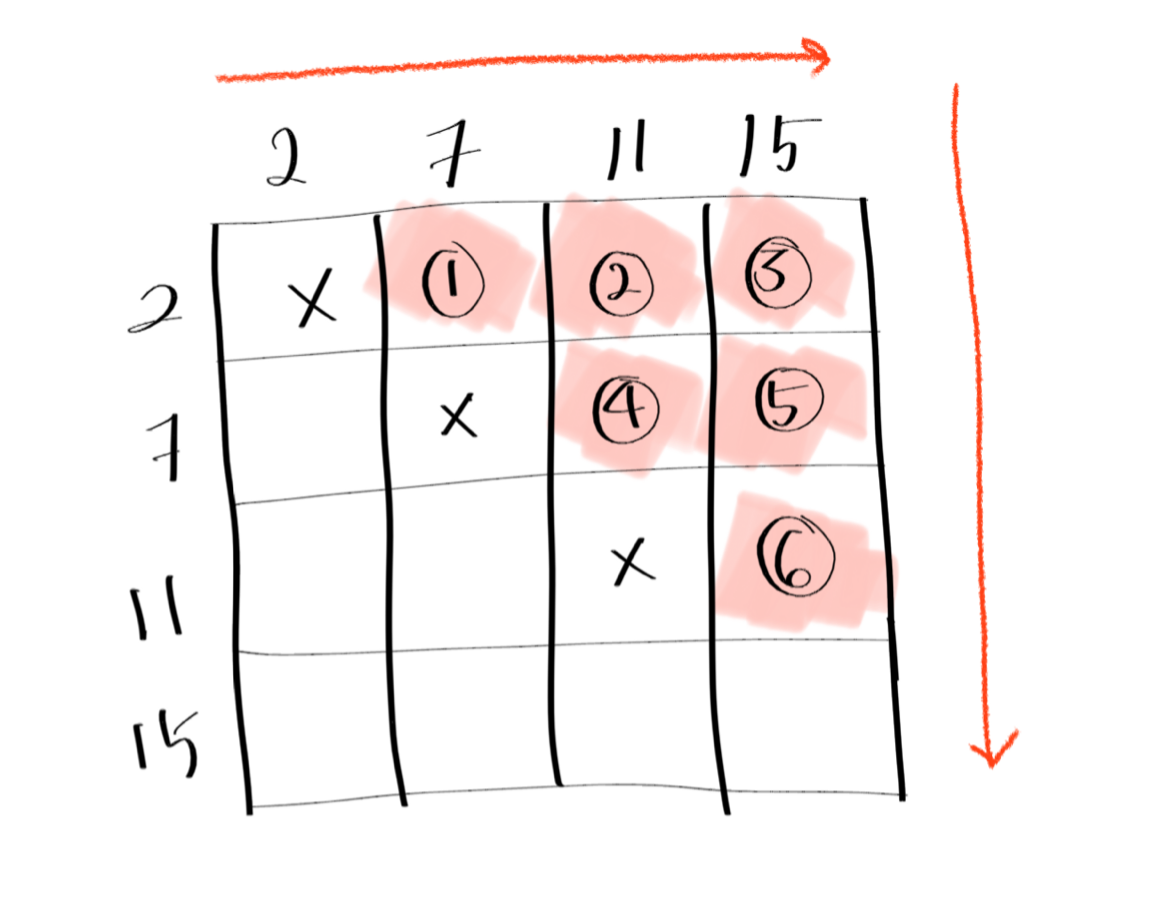 그림과 같은 방식으로 답을 도출하면 4*4 array를 계산 할 때 총 6번의 연산이 필요하다. 위의 brute force (하나씩 다 계산해 보는 것) 방식을 파이썬으로 나타내면 다음과 같다. 모든 쌍을 하나씩 다 더해보며 target이 되는 경우를 찾는 방식이다.
