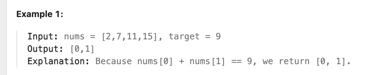 - 반환해야 하는 값: nums 중에서 더해서 target이 되는 값의 각각의 인덱스 번호