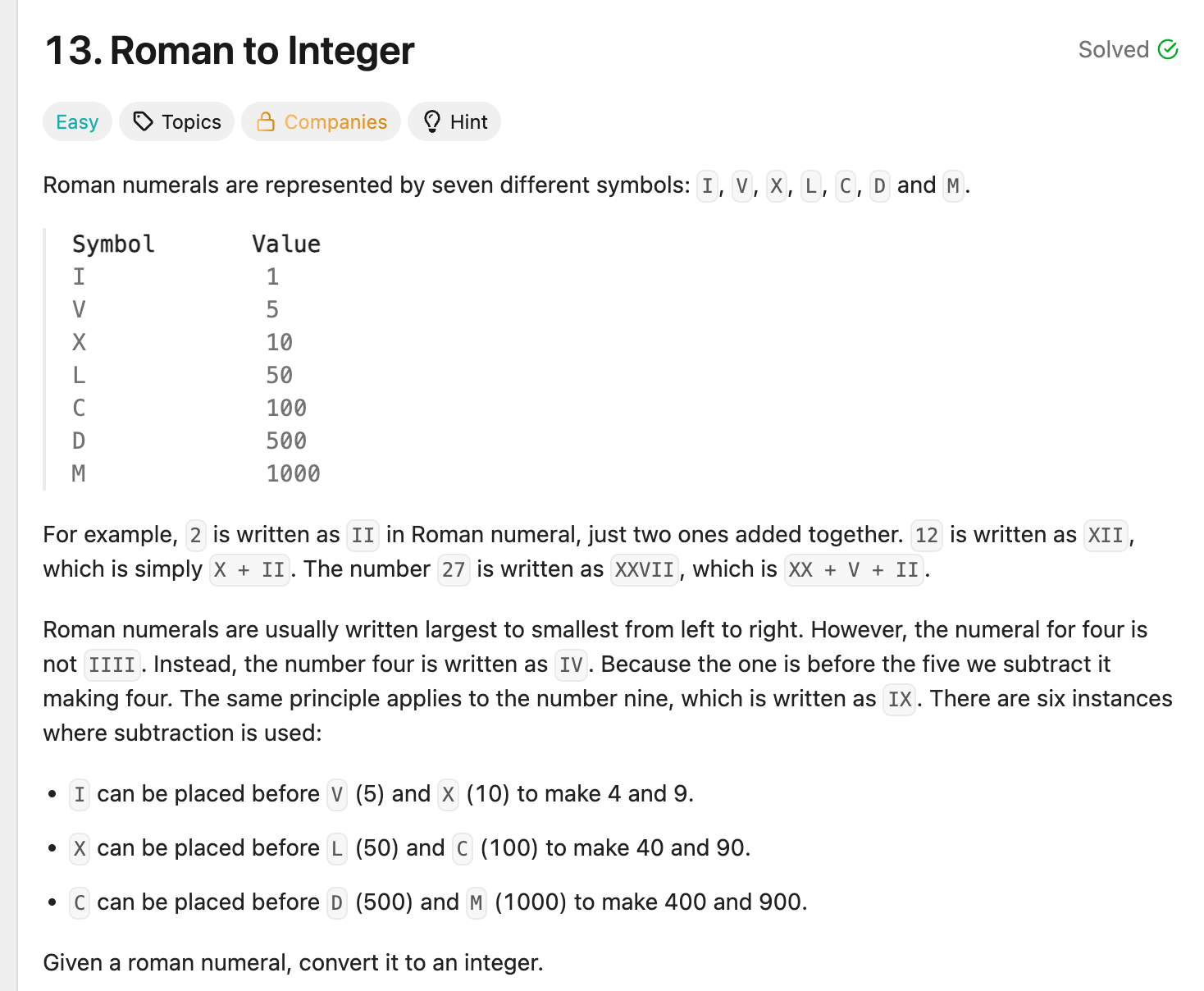 val = {"I": 1, "V": 5, "X": 10, "L": 50, "C": 100, "D": 500, "M": 1000}