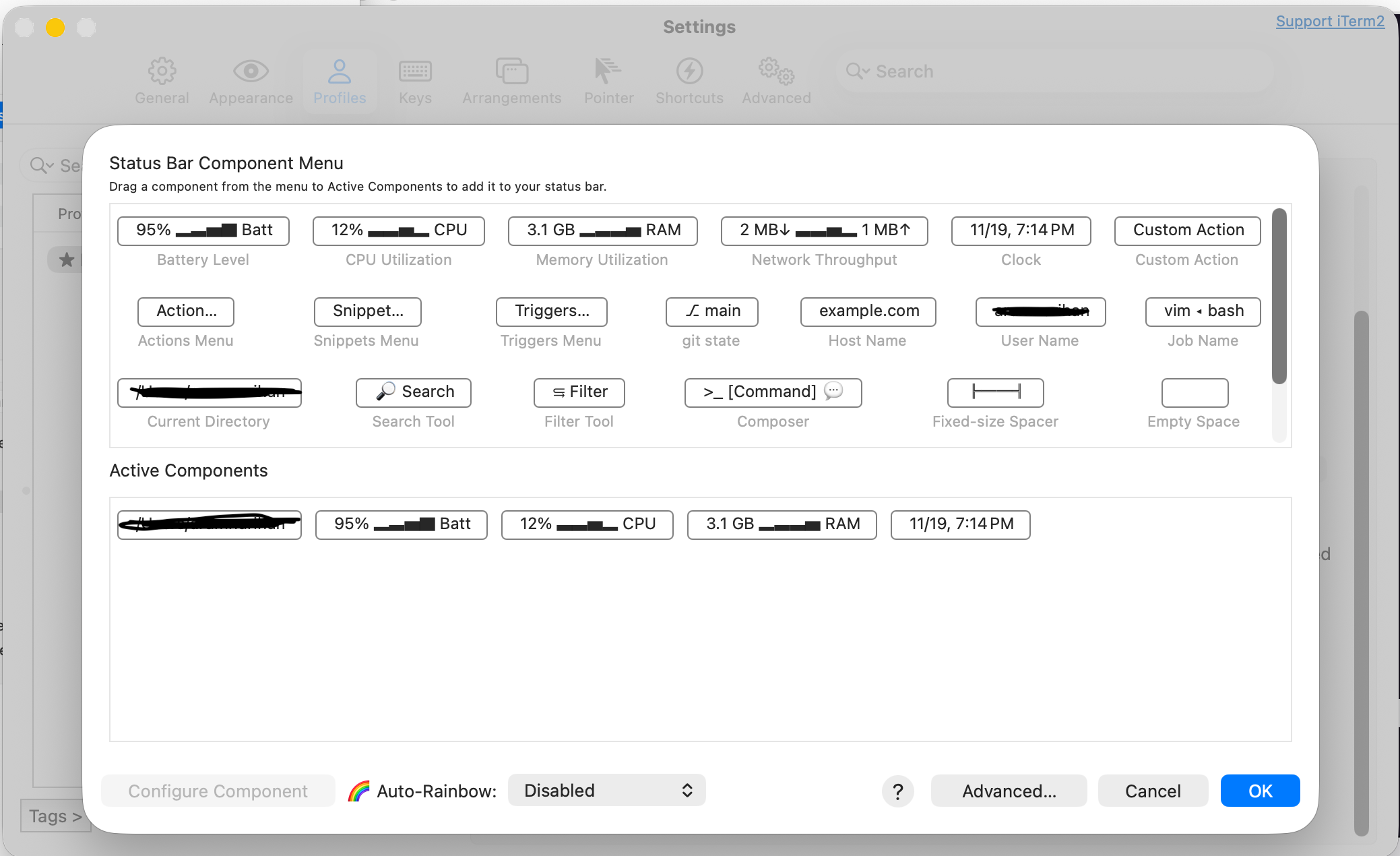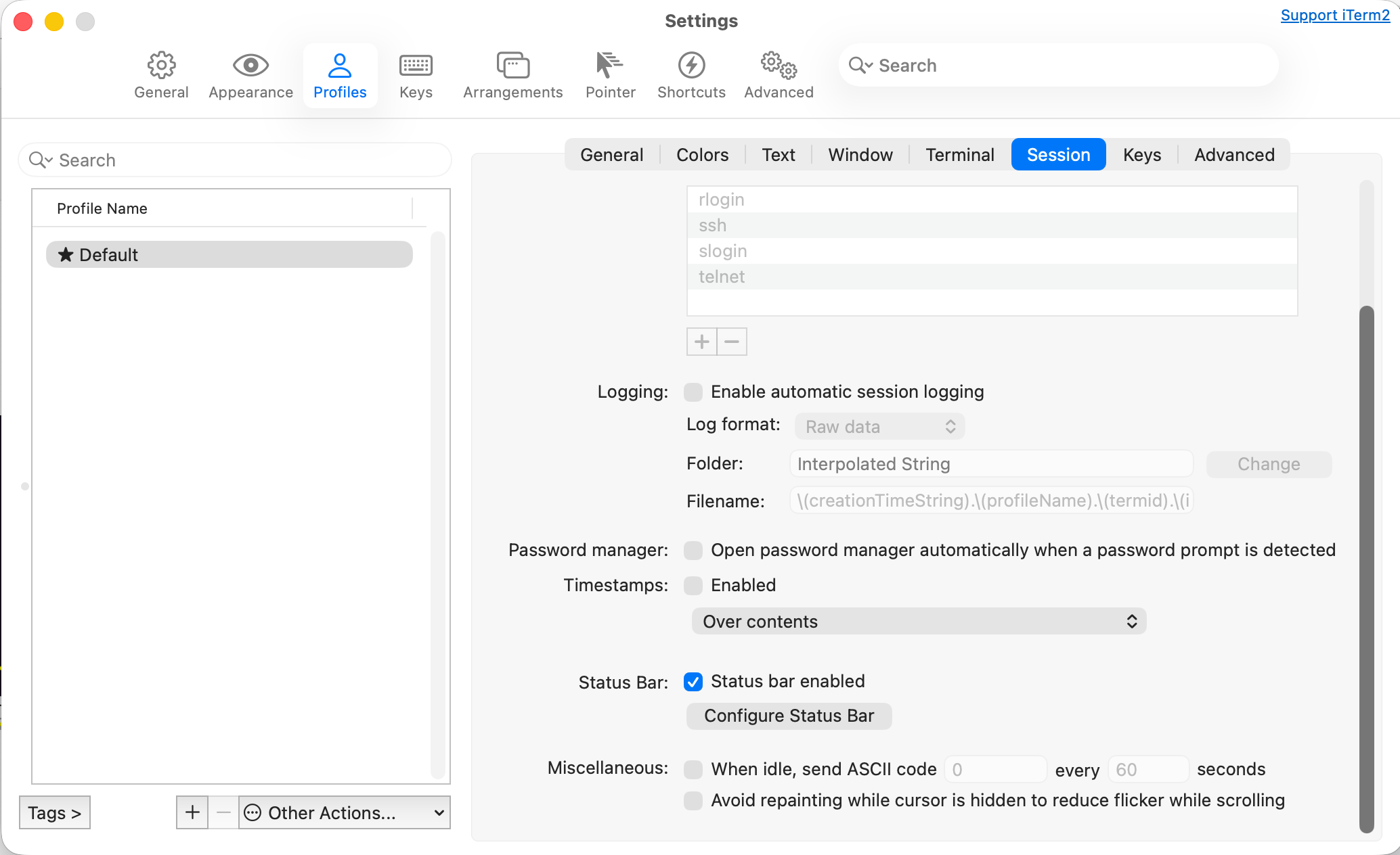 - iTerm2 -> Settings > Profile -> Session -> Status Bar